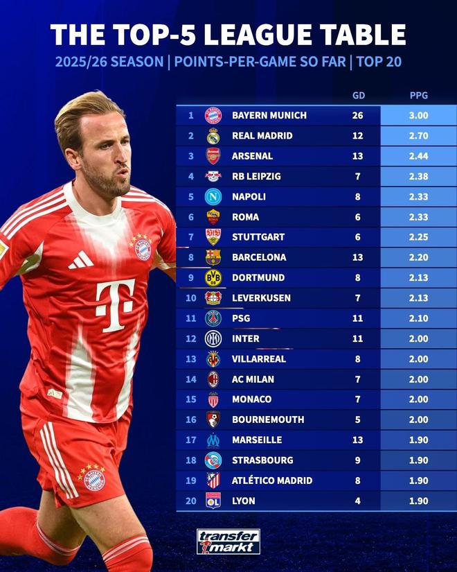 北京时间10月31日,德转统计出了本赛季至今欧洲五大联赛场均积分排名前20的俱乐部,德甲前8轮全胜的拜仁慕尼黑高居第一,皇家马德里2.7分排名第二,阿森纳2.44分排名第三。